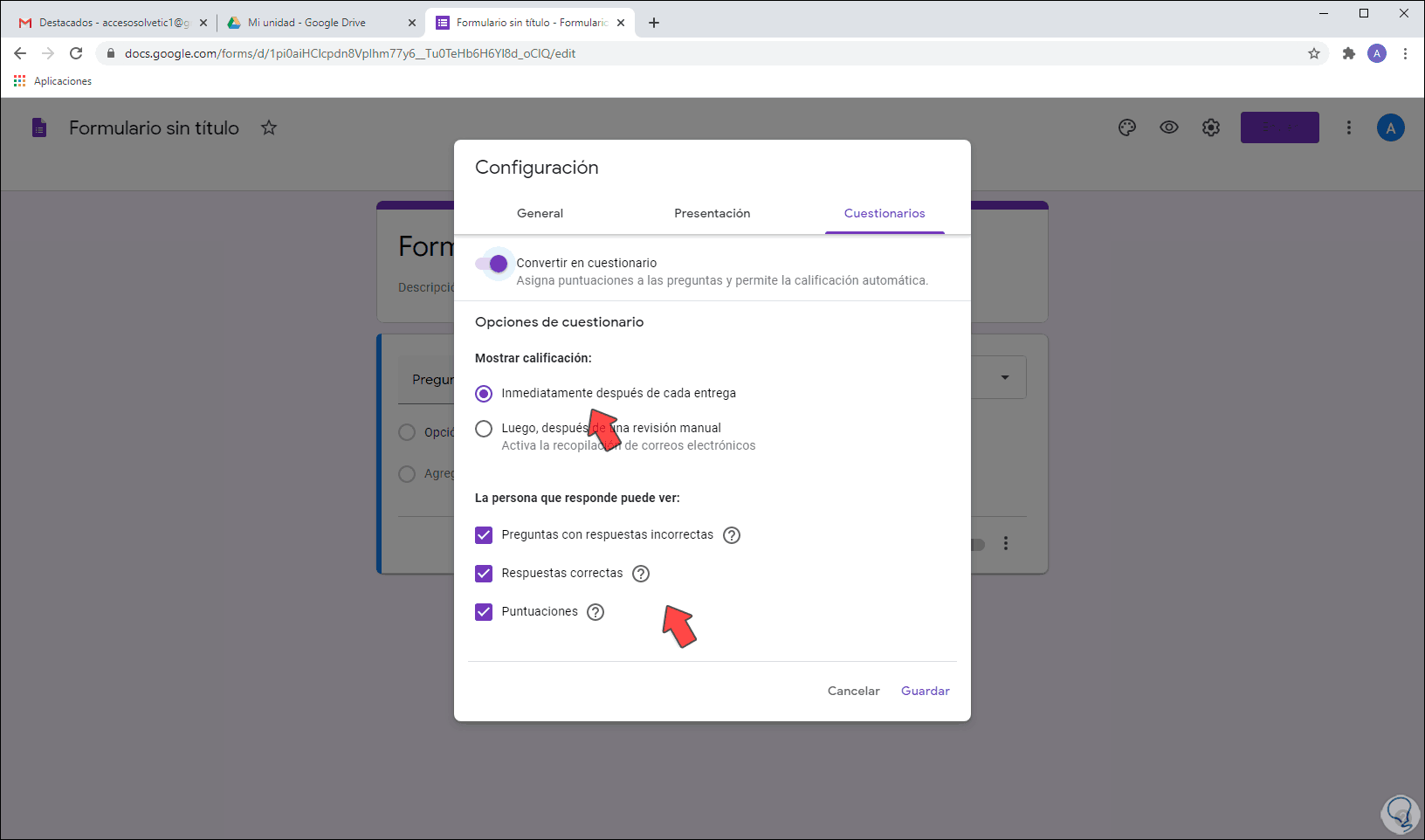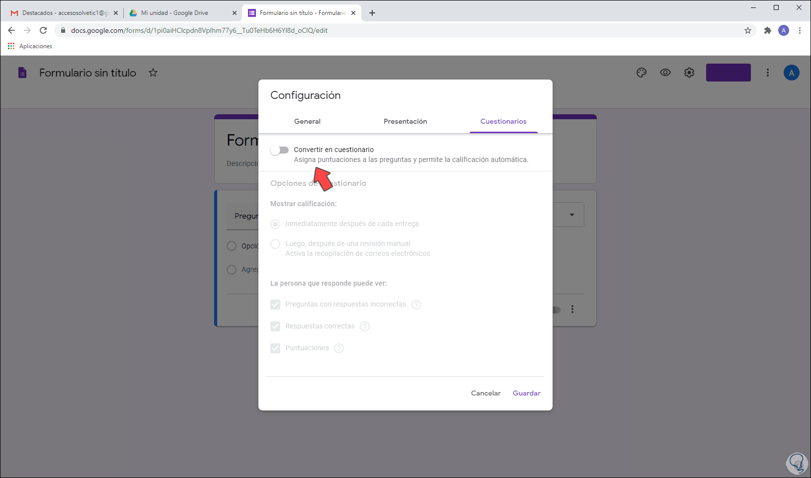 Esta zona permite que el formulario de Google sea convertido en una prueba de evaluación, en primer lugar, activamos el interruptor “Convertir en cuestionario”: