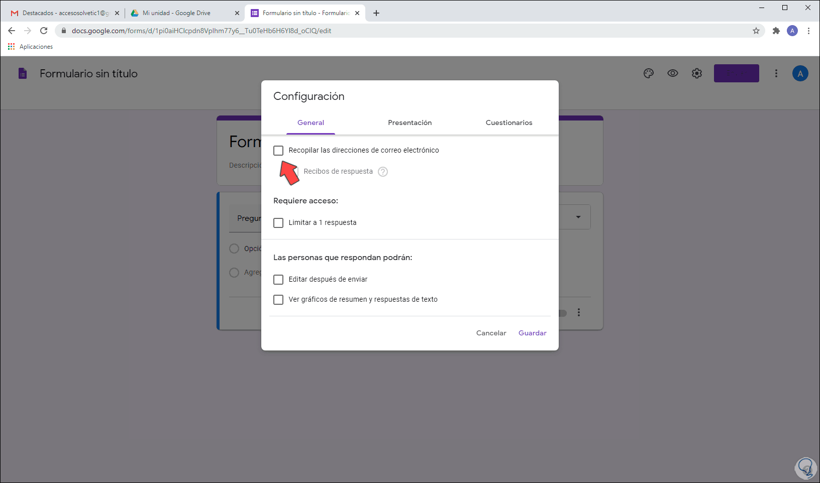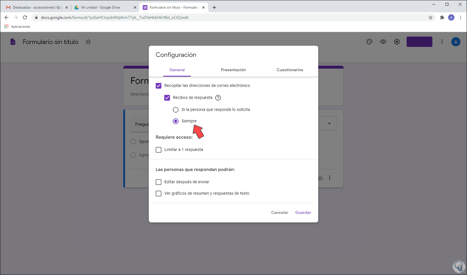 Allí activamos la casilla “Recopilar las direcciones de correo electrónico” la cual obliga al usuario a registrar su correo para responder las preguntas formuladas, activamos la casilla “Recibos de respuestas” con el fin de que el usuario que ha respondido las respuestas reciba una notificación en su correo con la respuesta seleccionada, allí podemos establecerlo siempre o solo si el usuario lo requiere: