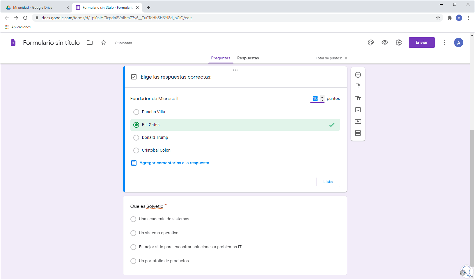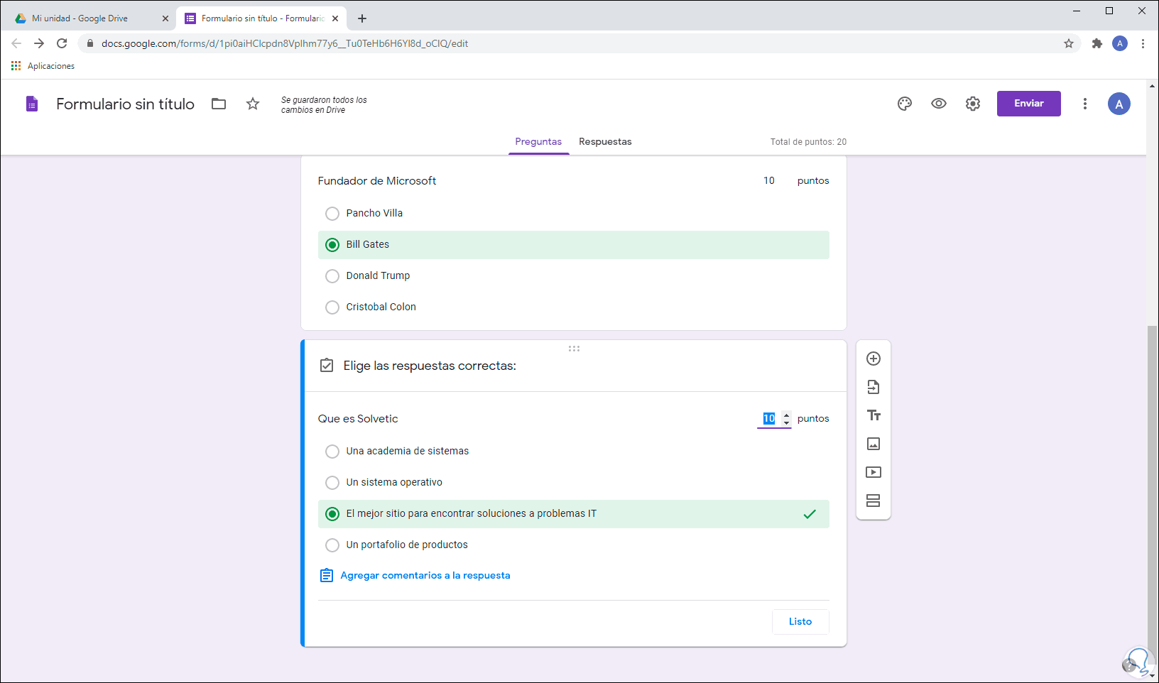 Seleccionamos la respuesta correcta e ingresamos cuantos puntos da esta respuesta: