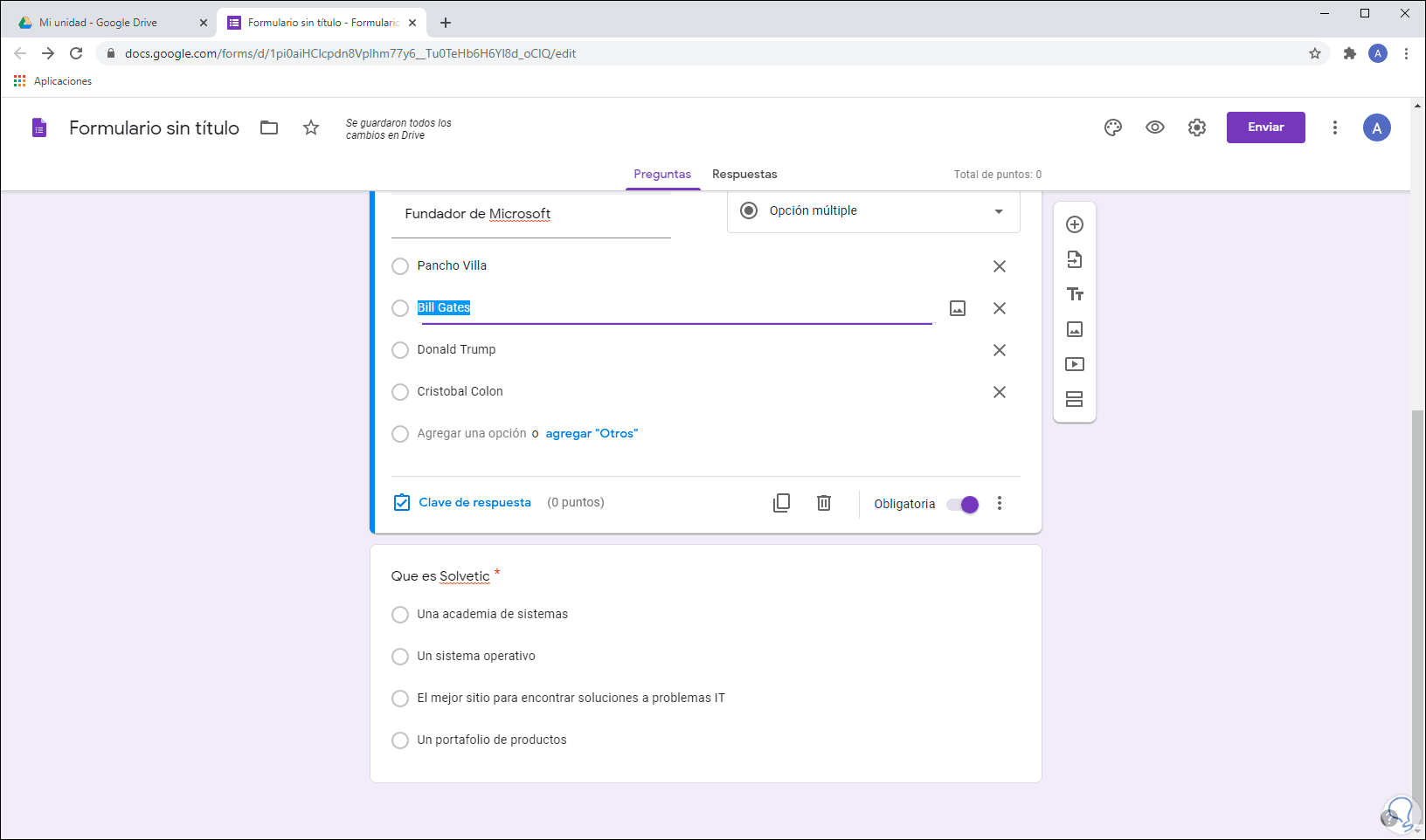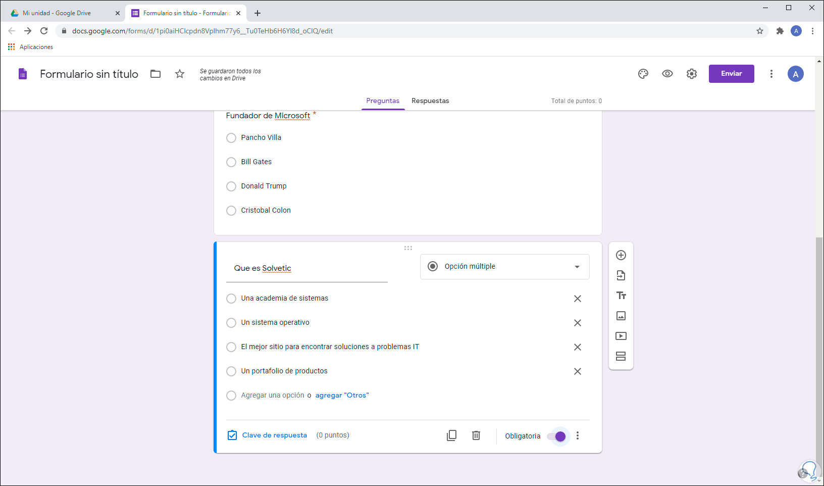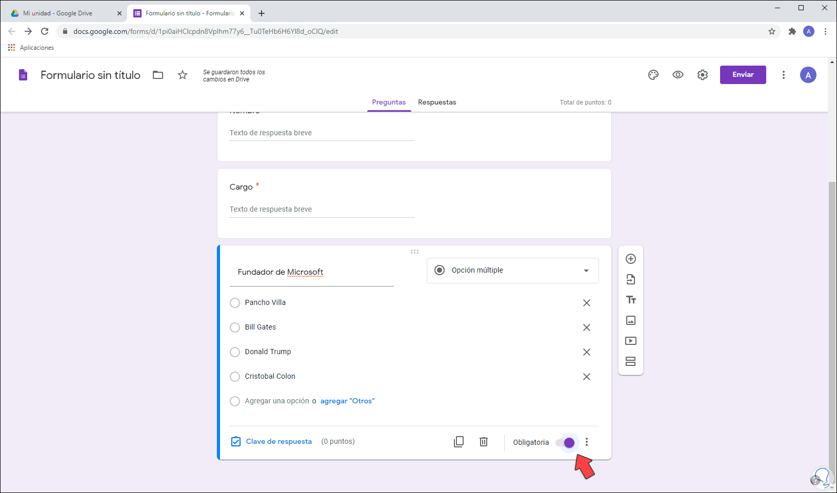 Para ingresar nuestras preguntas debemos seleccionar “Opción múltiple” e ingresar las posibles respuestas, este debe ser obligatoria: