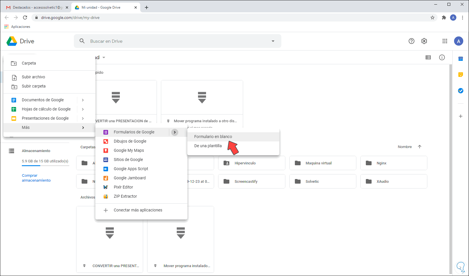 En Drive pulsamos sobre el botón “Nuevo” y vamos a la ruta “ Más – Formulario de Google – Formulario en blanco”: