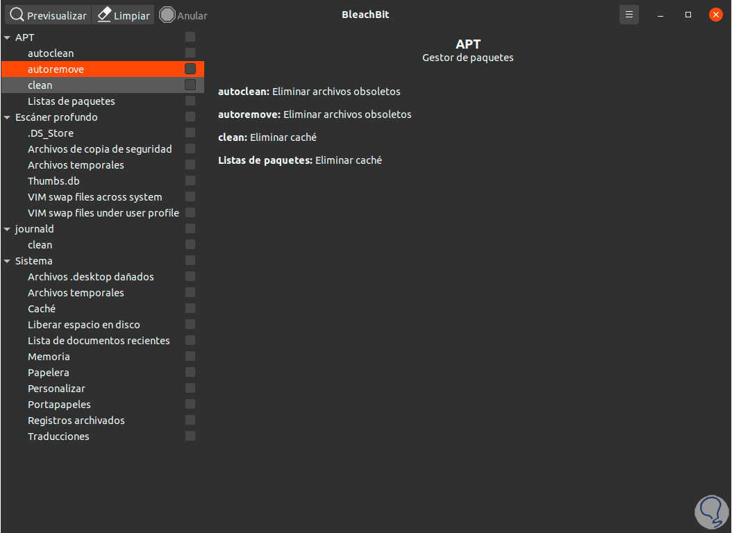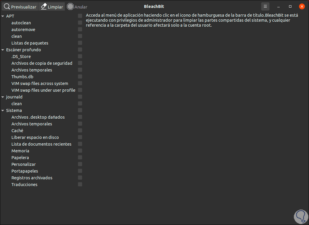 Una vez salgamos de las preferencias este será el entorno de trabajo de BleachBit: