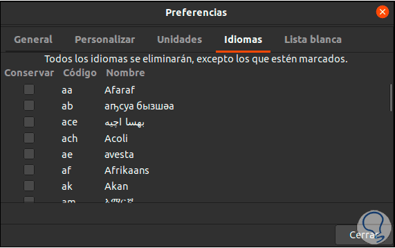 En la pestaña “idiomas” será posible definir en qué idioma se ha de ejecutar BleachBit en Linux: