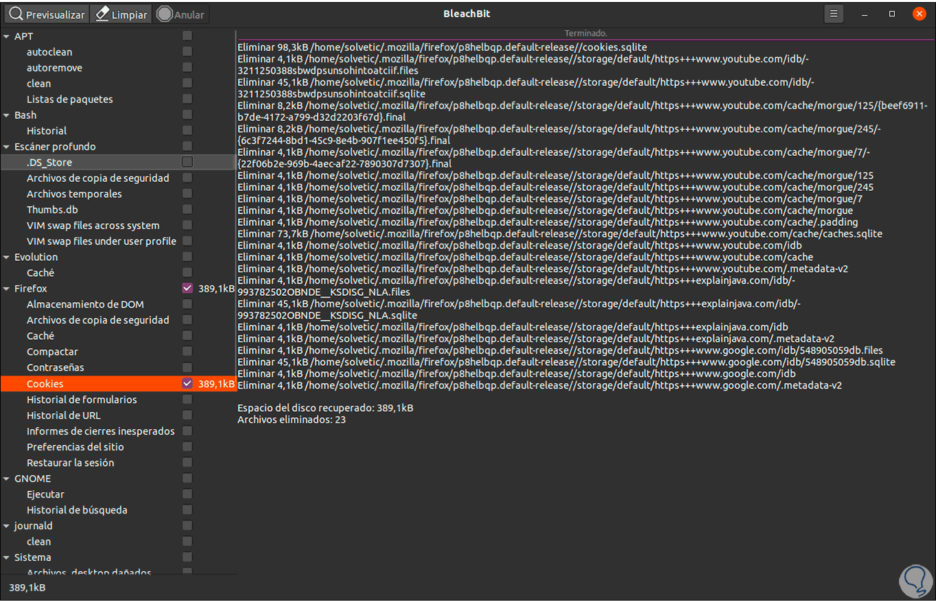 Como mencionamos, al ejecutarse como sudo despliega carpetas del sistema, si ejecutamos BleachBit sin sudo accedemos a las aplicaciones locales del usuario que ha iniciado sesión:
