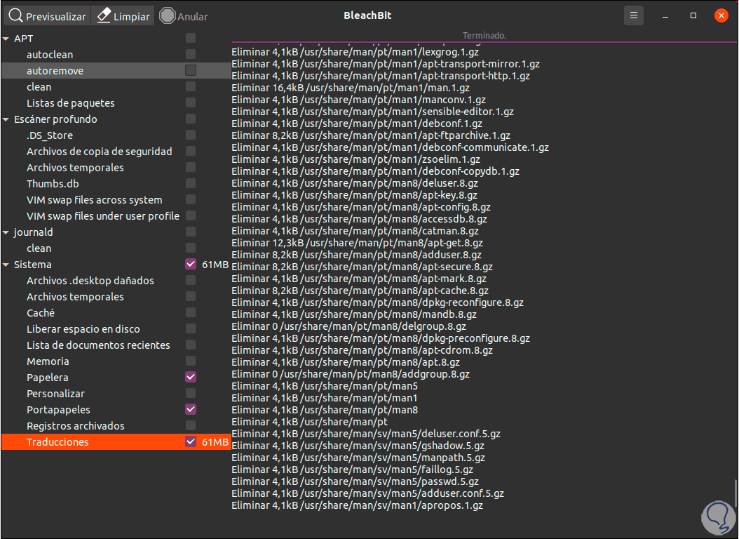 En sistemas Linux es posible usar el comando “rm” para este tipo de eliminación de objetos, pero una de las grandes ventajas de usar BleachBit es que es posible realizar un escaneo completo del disco para luego eliminar un tipo específico de archivos.