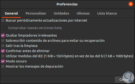 Al ejecutar como sudo veremos que se despliega la ventana de preferencias de BleachBit la cual nos ofrece diferentes opciones: