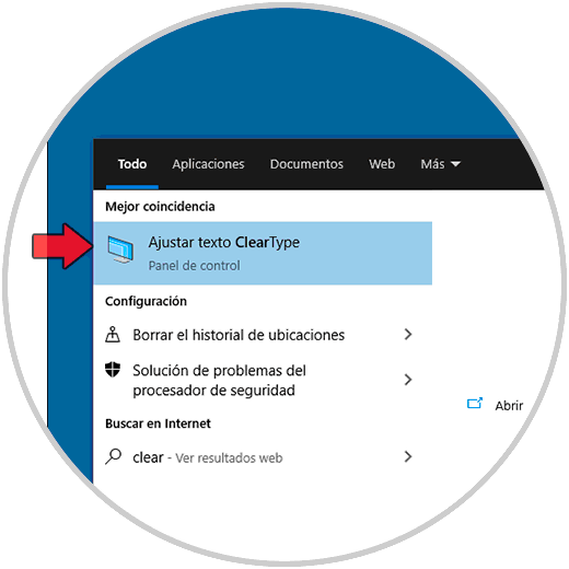 Para lograr administrar ClearType en Windows 10 vamos al cuadro de búsqueda de Inicio e ingresamos “clear”, seleccionamos la opción “Ajustar texto ClearType”: