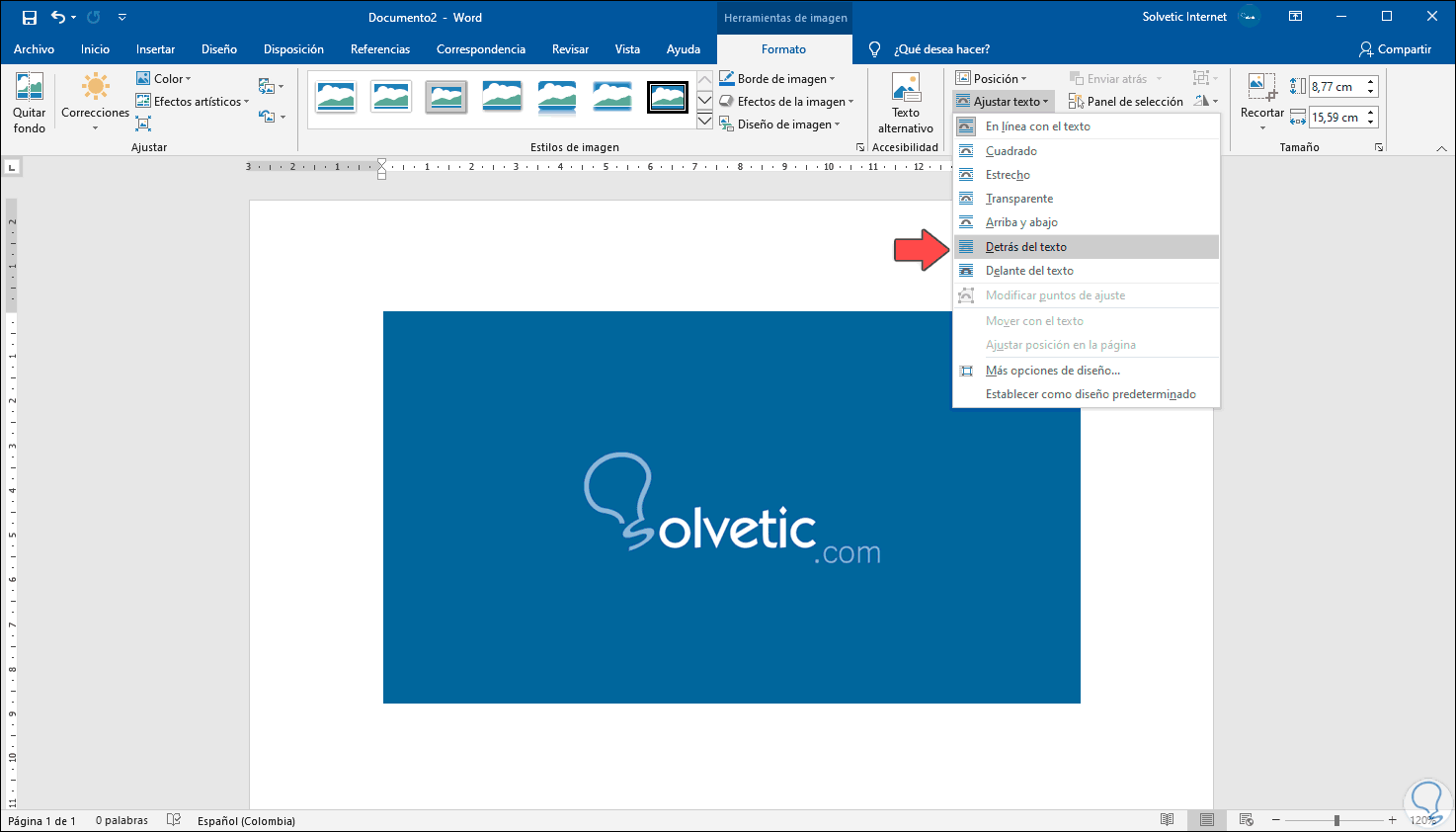 Como decimos, dentro de estas opciones de Word podremos agregar texto encima de la imagen que ha sido insertada, además pudiendo personalizar el texto que añadimos con formatos elegidos por nosotros. Solvetic te explicará en detalle cómo puedes añadir texto encima de una imagen de forma funcional.
