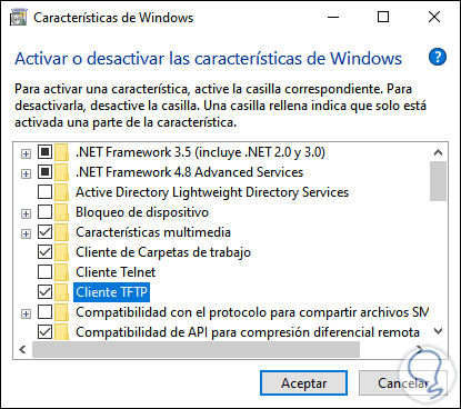 Dism /online /Enable-Feature /FeatureName:"Nombre" -AllPor ejemplo, si vamos a activar “TFPT” ingresamos: