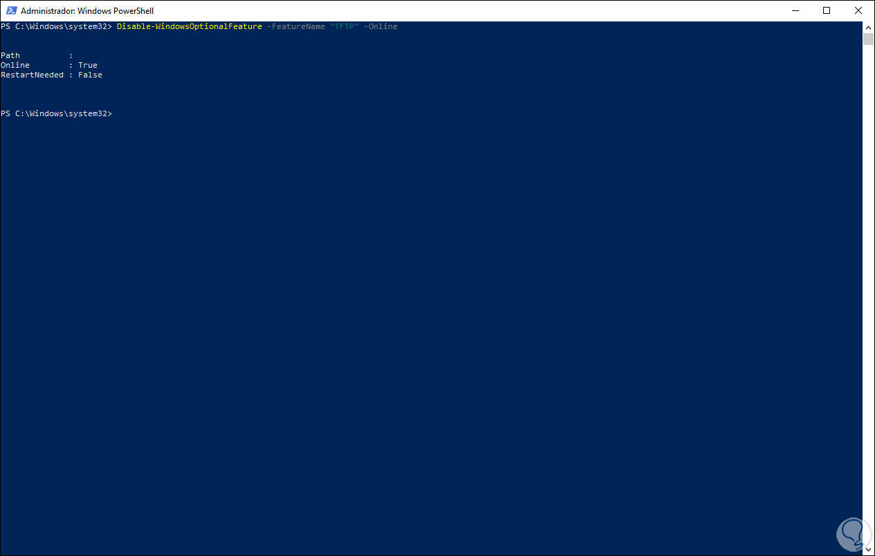 Dism /online /Disable-Feature /FeatureName:"Nombre"Para desactivar TFTP ejecutamos lo siguiente:
