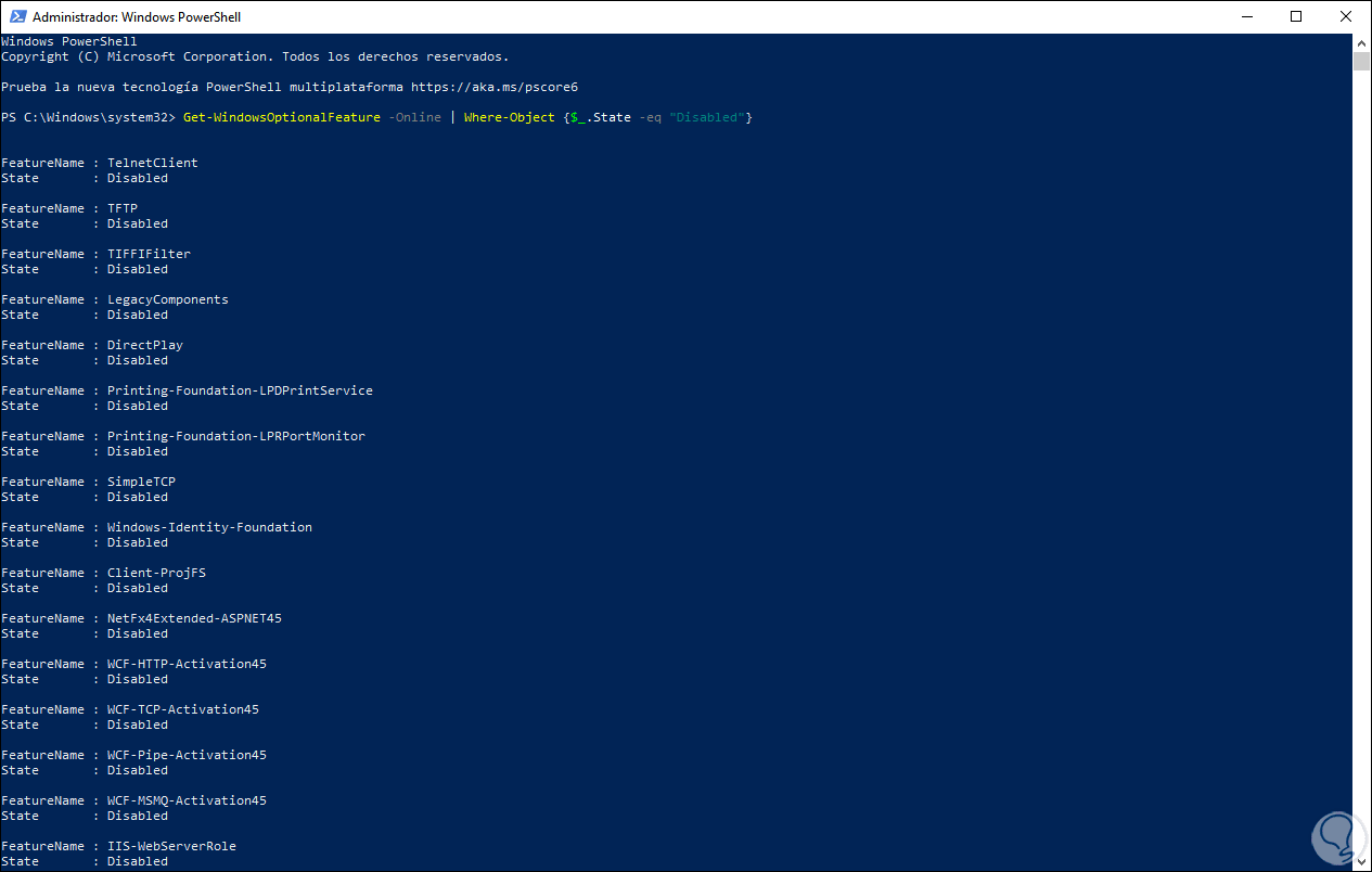 Por ello para activar una característica a través de este método debemos conocer primero cuales están deshabilitadas, ejecutamos lo siguiente en la consola de PowerShell como administradores: