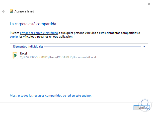 Damos clic en el botón “Compartir” y veremos la ruta asignada para tal fin. Damos clic en Listo y cerramos la ventana anterior.