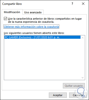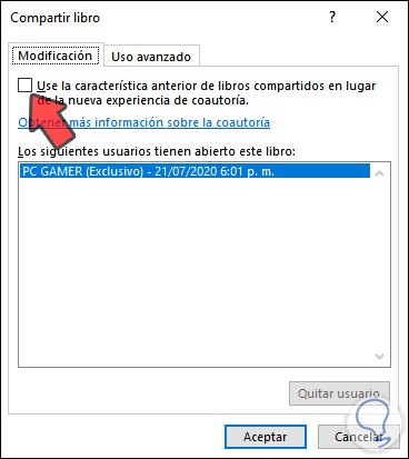 Damos clic allí y veremos lo siguiente. Allí están los cambios que han sido realizados, en este caso por el usuario actual con fecha y hora, activamos la casilla “Use la nueva característica de libros compartidos en lugar de la nueva experiencia de coautoría”