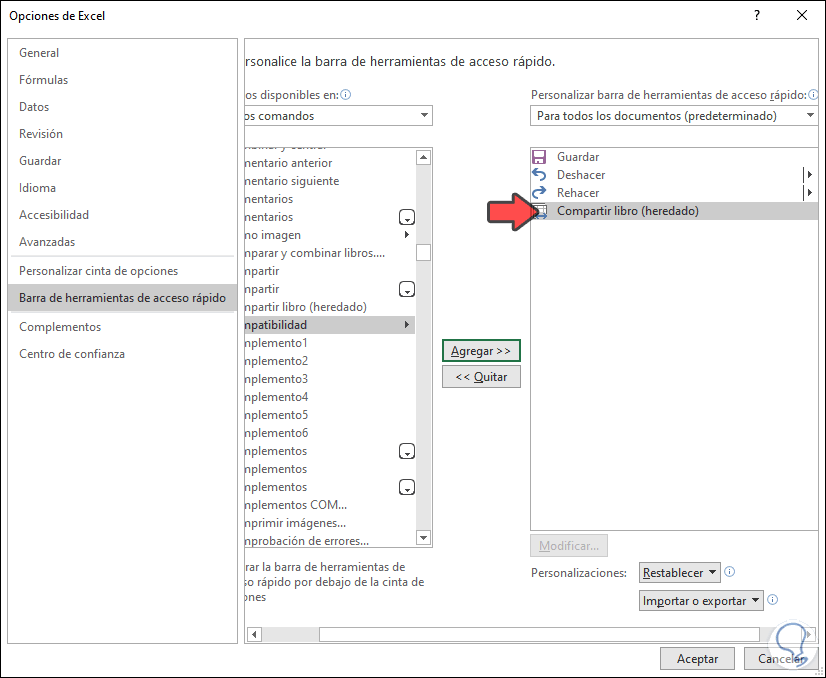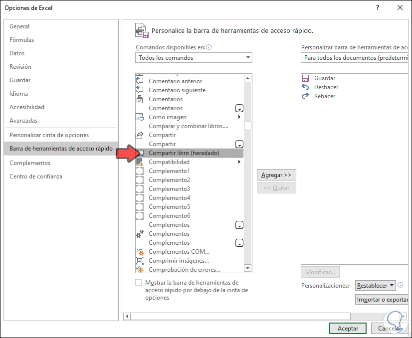 En la ventana desplegada vamos a la sección “Barra de herramientas de acceso rápido” y en la parte superior seleccionamos “Todos los comandos”, en el panel central ubicamos el comando llamado “Compartir libro (heredado)”: