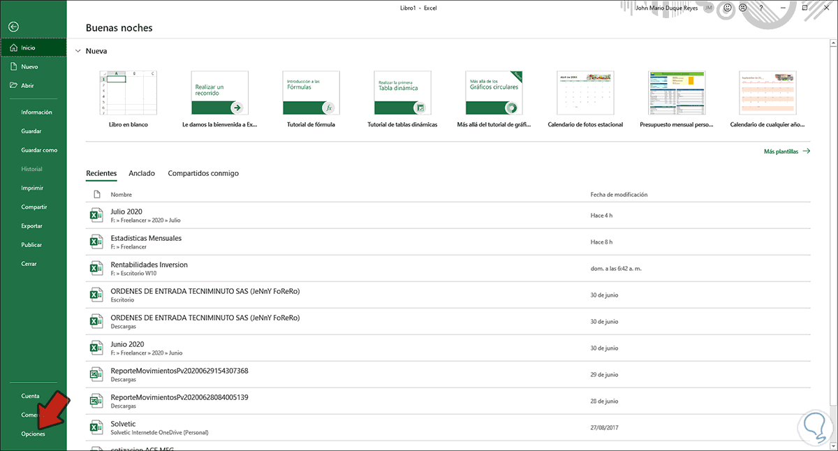 Lo primero será ingresar algunos datos en la hoja de cálculo y luego nos vamos al menú Archivo. Damos clic en “Opciones”