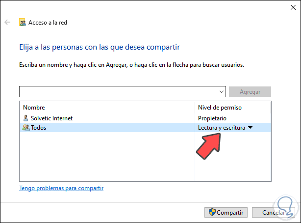 En la ventana emergente seleccionamos “Todos” , lo agregamos y le damos permisos de lectura y escritura: