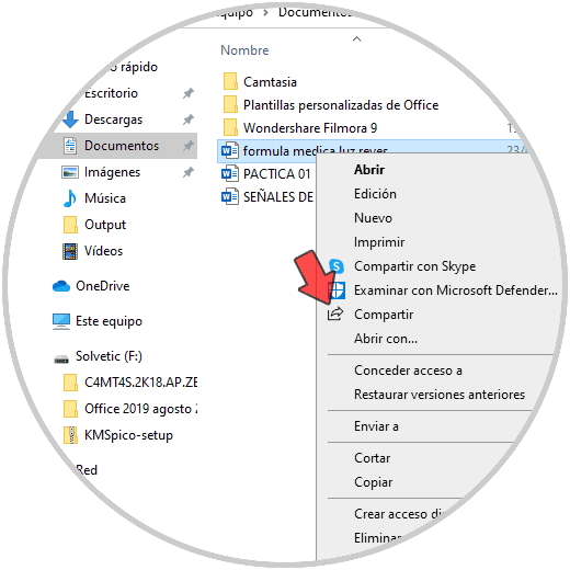 Finalmente podemos usar la opción de compartir un archivo directamente a través del Uso compartido y consiste en ir algún archivo, dar clic derecho sobre este y en el listado desplegado seleccionamos “Compartir”:
