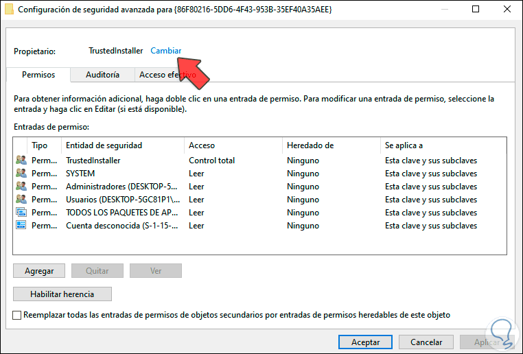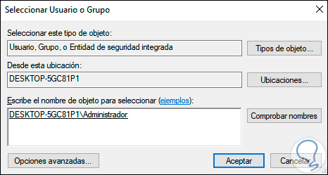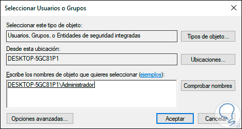 En la parte superior damos clic en la línea “Cambiar” y posterior a ello debemos agregar el grupo Administrador, damos clic en “Comprobar nombres” para asegurarnos de que sea el grupo correcto: