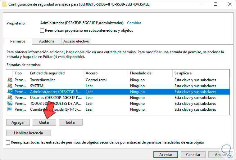 Ahora debemos eliminar todas las entradas excepto la línea “System”, para ello seleccionamos cada una y damos clic en “Quitar”. Damos clic en Aplicar y Aceptar para guardar los cambios.