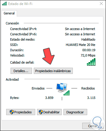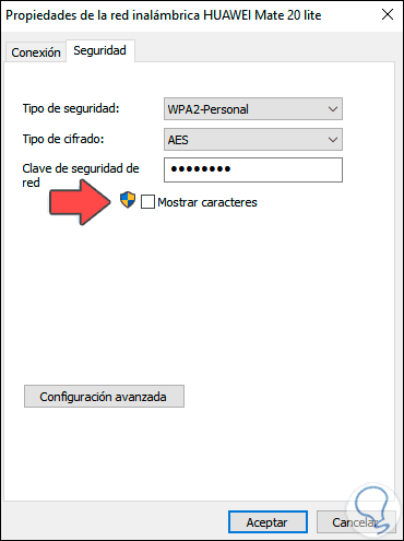 Damos clic en “Propiedades inalámbricas” y en la siguiente ventana vamos a la pestaña “Seguridad” y allí activamos la casilla “Mostrar caracteres” para visualizar la contraseña de Wi-Fi: