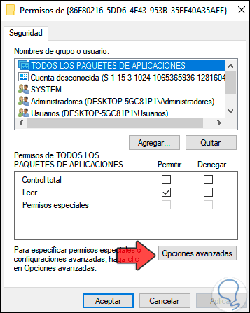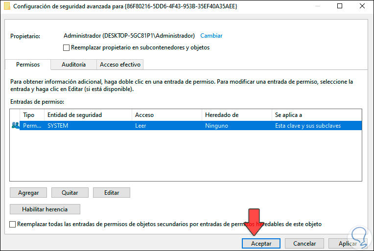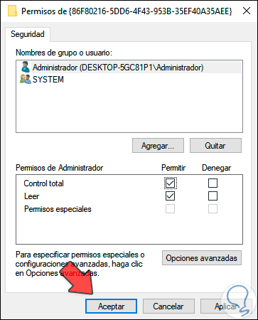 Damos clic en Aceptar y le daremos los permisos adecuados: