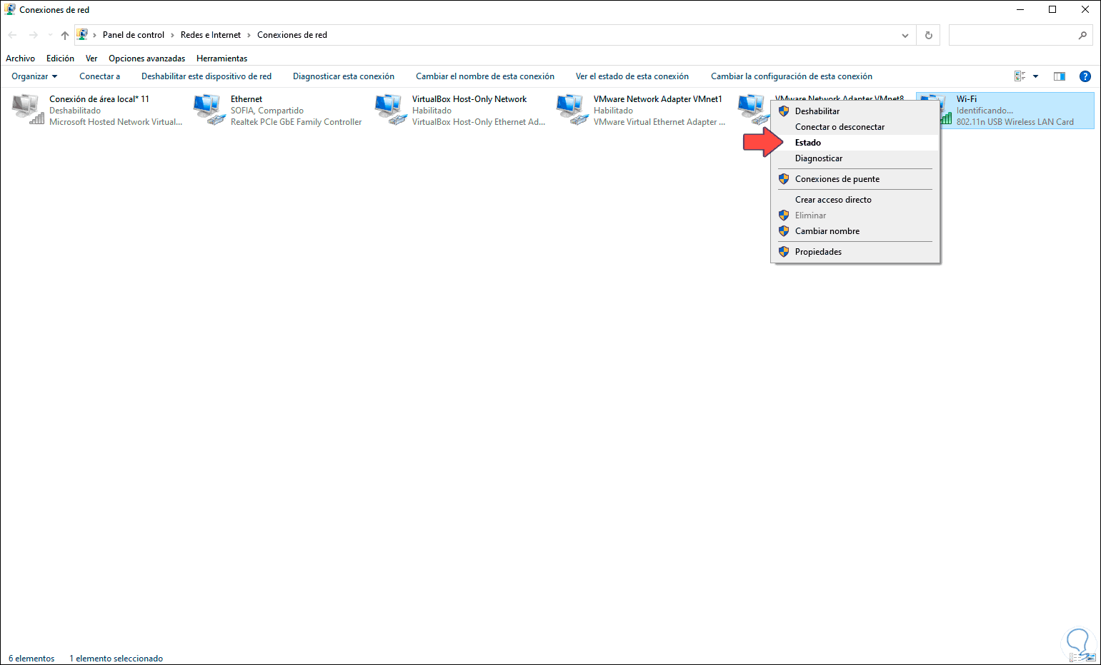 Allí damos clic derecho sobre el adaptador de red Wi-Fi y seleccionamos “Estado”: