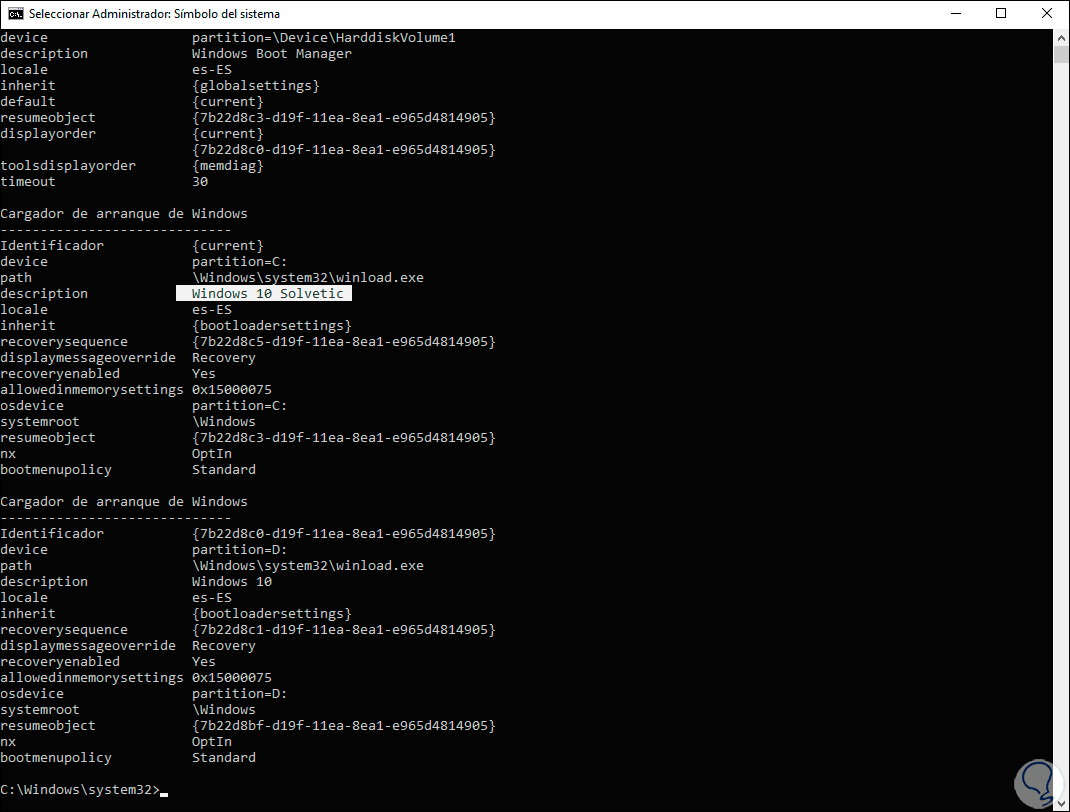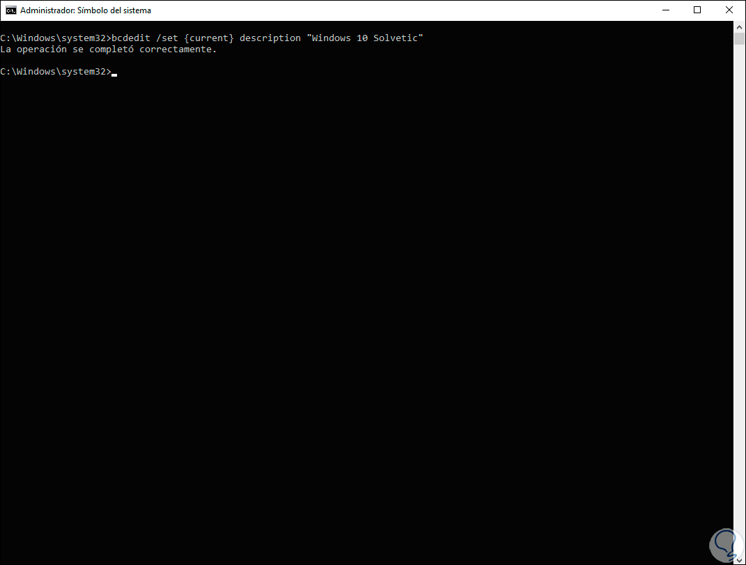 bcdedit /set {current} description "Windows 10 Solvetic"