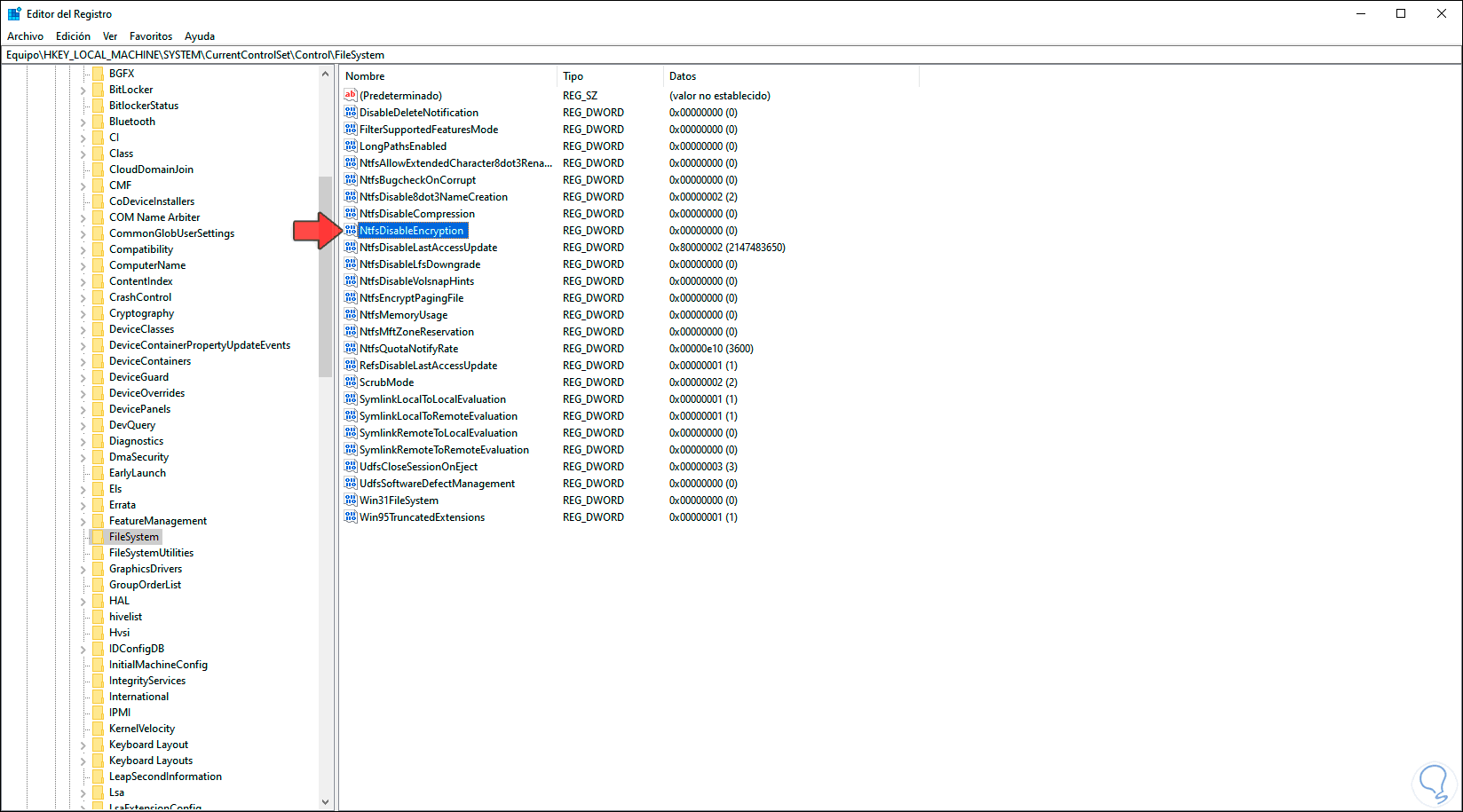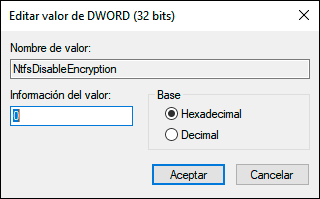Este valor DWORD será llamado “NtfsDisableEncryption”: