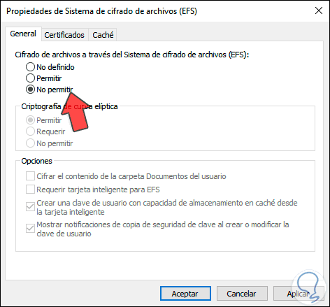 En la ventana emergente vamos a la pestaña “General” y activamos la casilla “No permitir”. Damos clic en Aplicar y Aceptar para guardar los cambios. Para activar EFS debemos marcar la casilla “Permitir”.