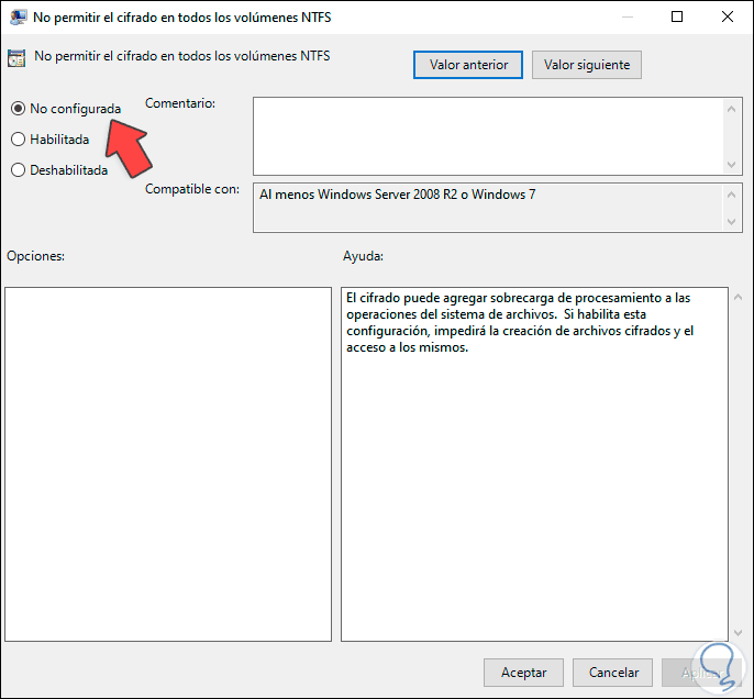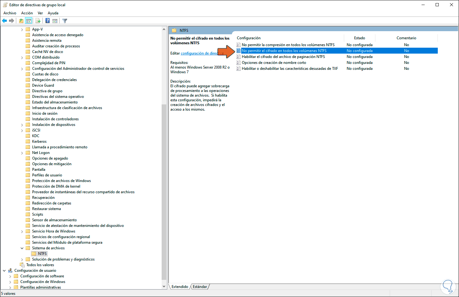 Allí debemos ubicar la política llamada “No permitir el cifrado en todos los volúmenes NTFS”: