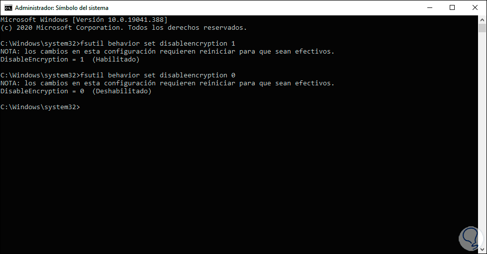 Para desactivar EFS: fsutil behavior set disableencryption 1 Para activar EFS: fsutil behavior set disableencryption 0