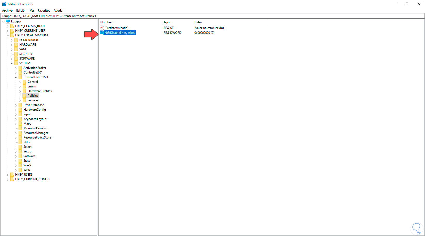 3. Activar o desactivar EFS Windows 10 desde Editor de Registro