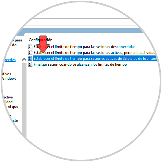 En la parte central ubicamos la política llamada “Establecer el límite de tiempo para sesiones activas de Servicios de Escritorio remoto”: