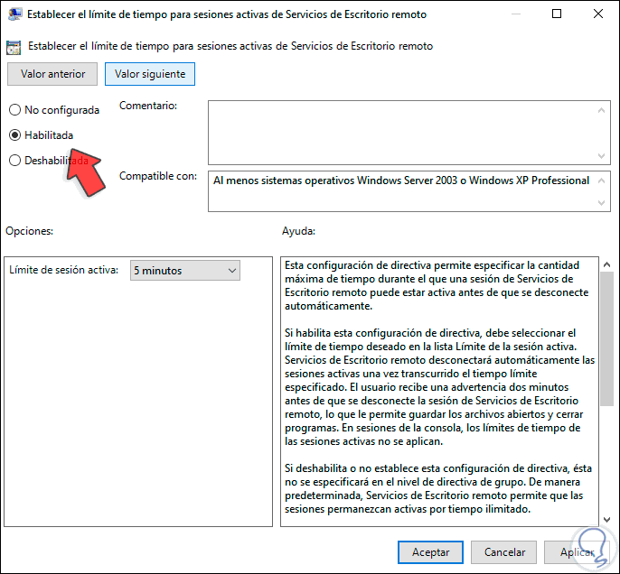 Damos doble clic sobre esta y en la ventana emergente activamos la casilla “Habilitada” y en la parte inferior definimos el tiempo a definir. Damos clic en Aplicar y Aceptar para confirmar los cambios.