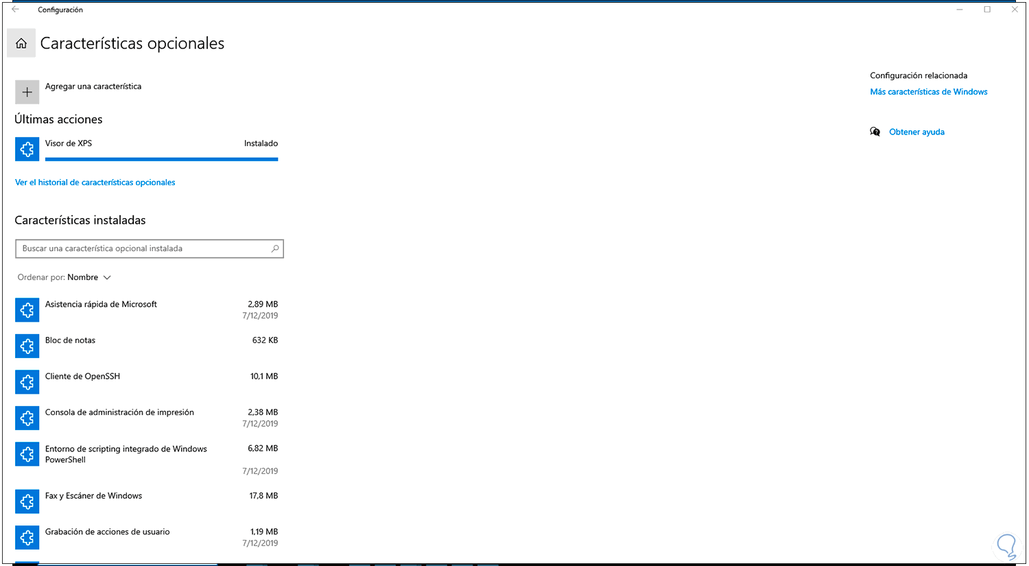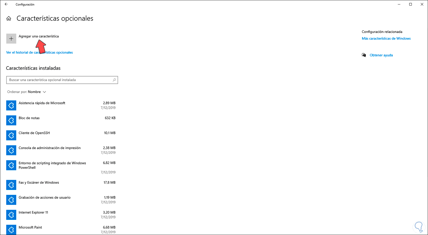 Damos clic en la línea “Características opcionales” y seremos redireccionados a la siguiente ventana: