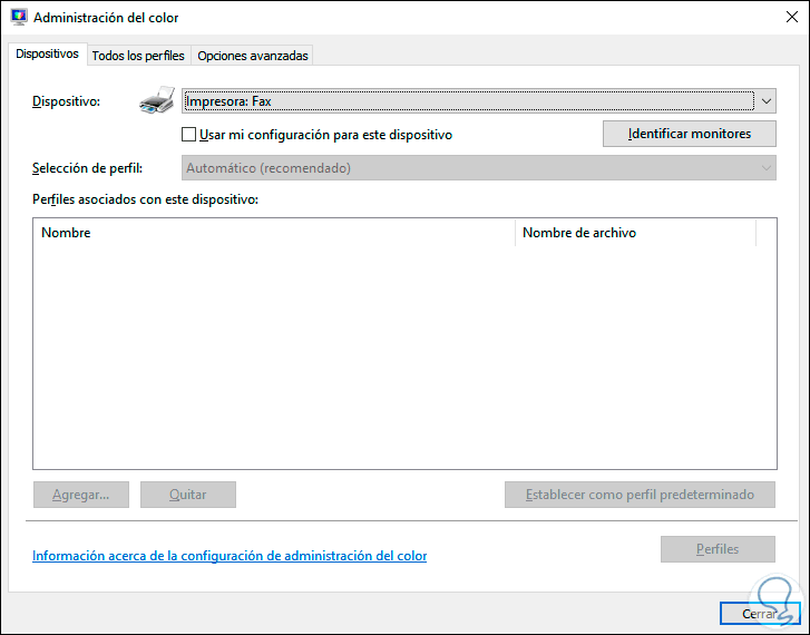 Con alguna de las opciones que hemos visto tendremos acceso a la Administración del color en Windows 10 y con ella estaremos en la capacidad para gestionar los perfiles de color para los dispositivos que se vean afectados de alguna forma: