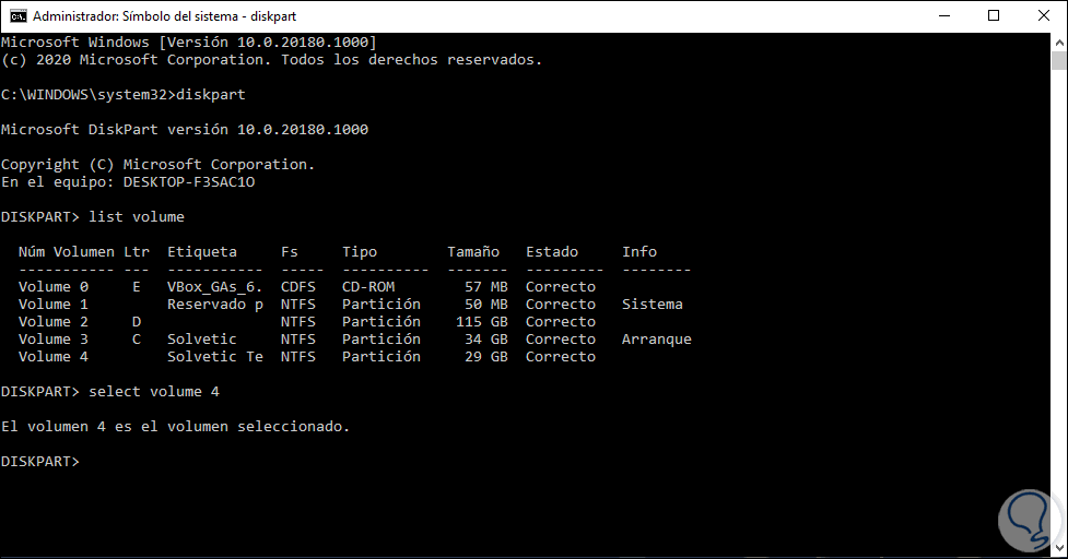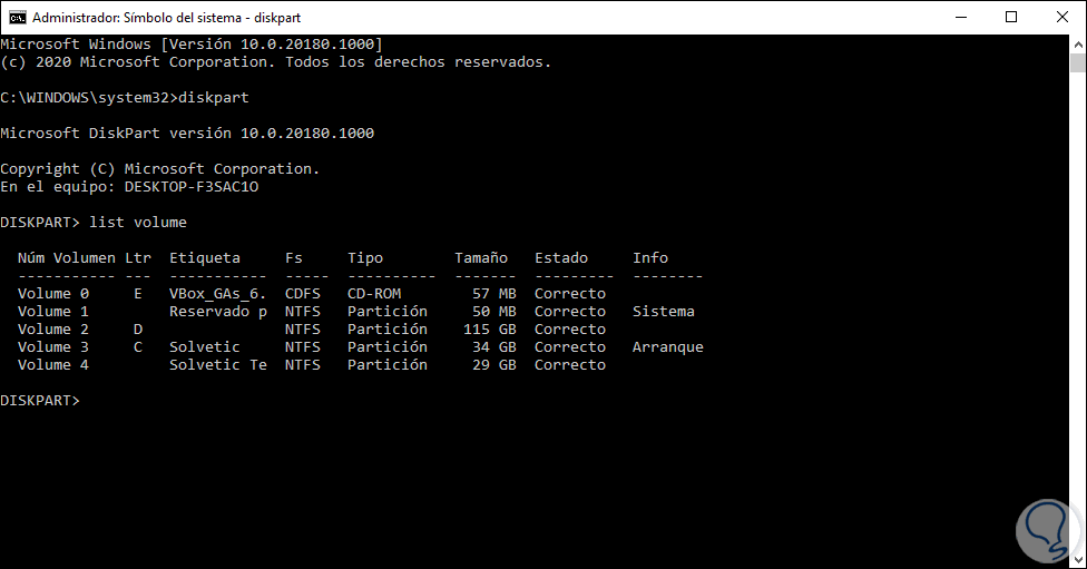 El siguiente paso será listar los volúmenes activos con el siguiente comando: