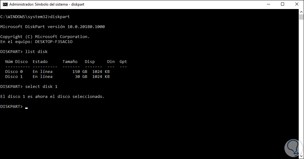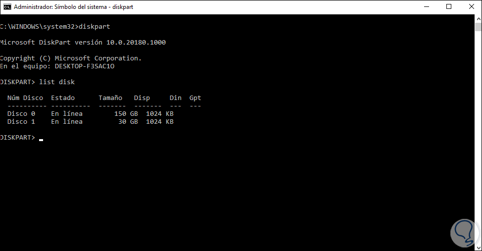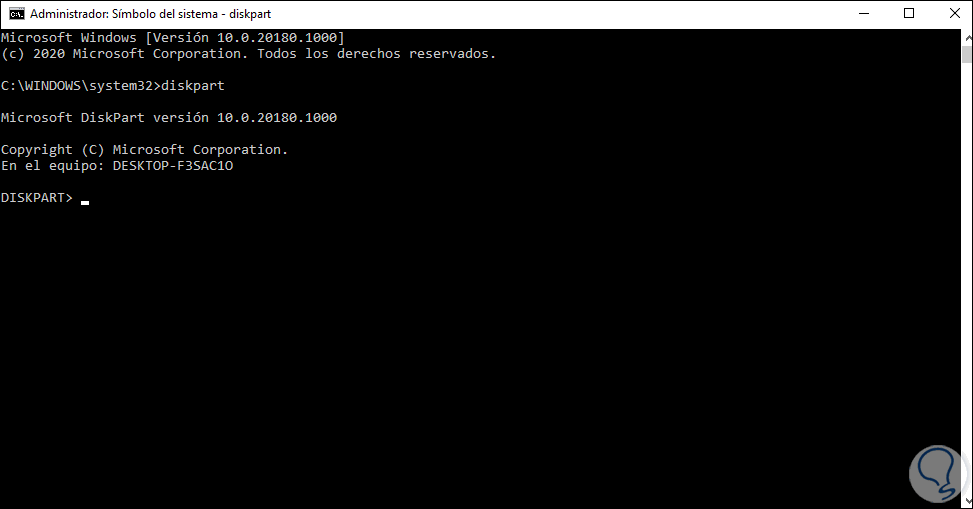 Lo primero que haremos será acceder a la consola del símbolo del sistema como administradores y en ella ejecutar el comando “diskpart” el cual es el administrador de discos y volúmenes integrado en Windows 10: