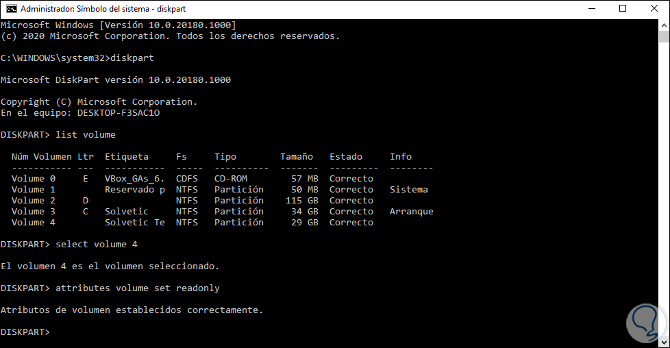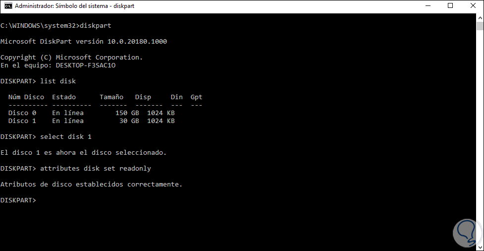 Si la idea es proteger un disco, en Diskpart debemos ejecutar el siguiente comando: