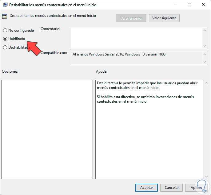 - Para que no se active el menú contextual activamos la casilla “Habilitada”