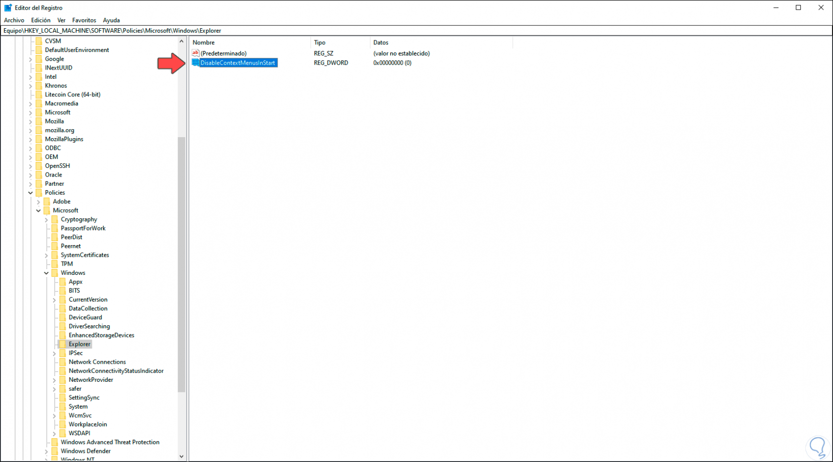 Este valor será llamado “DisableContextMenusInStart”: