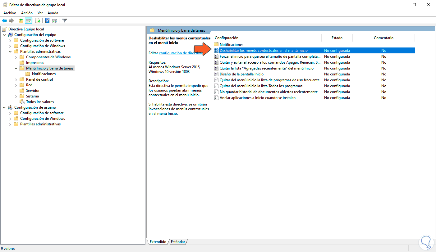 En el grupo de políticas ubicamos la llamada “Deshabilitar los menús contextuales en el menú Inicio”: