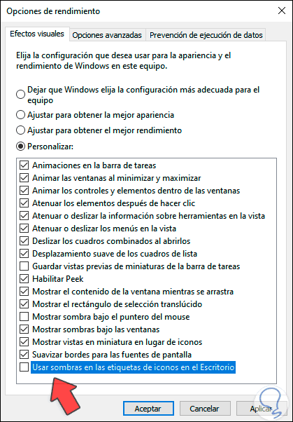Damos clic en el botón “Configuración” en la sección “Rendimiento” y en la siguiente ventana iremos a la pestaña “Efectos visuales”, allí debemos desactivar la casilla “Usar sombras en las etiquetas de iconos en el Escritorio”: