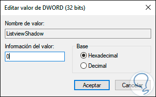 Debemos ubicar el valor DWORD llamado “ListViewShadow” y dar doble clic sobre él, en el campo “Información del valor” ingresamos el número 0 para quitar las sombras. Damos clic en Aplicar para completar el proceso.
