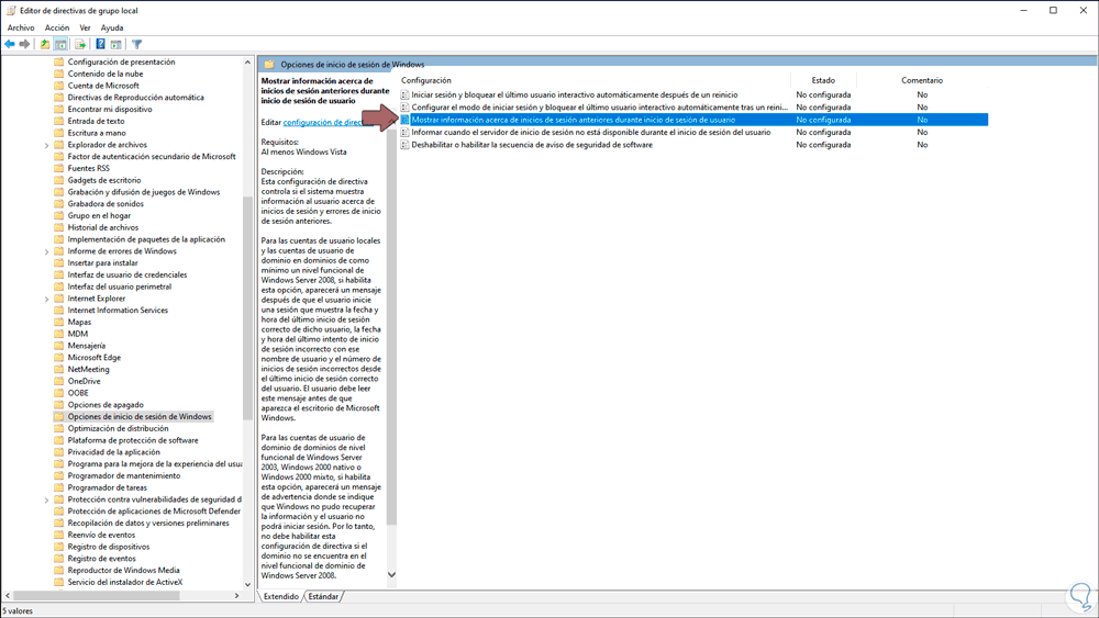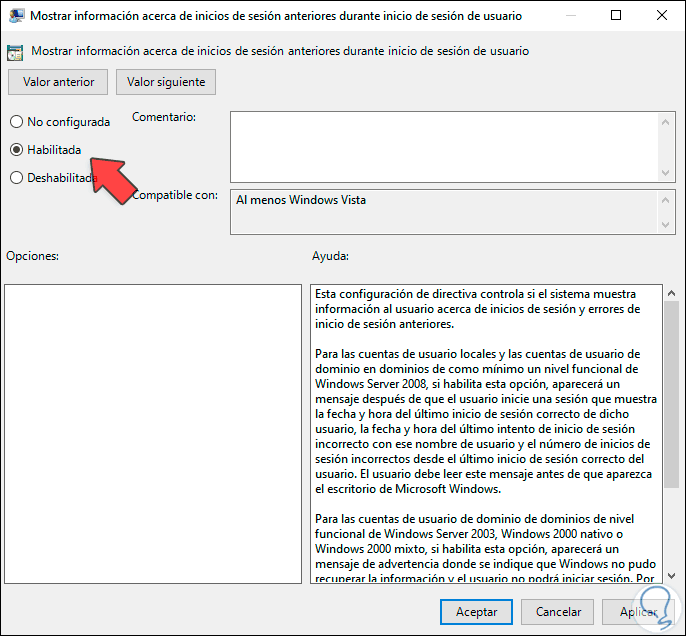 En la parte central ubicamos la política llamada “Mostrar información acerca de inicios de sesión anteriores durante inicio de sesión de usuario”: