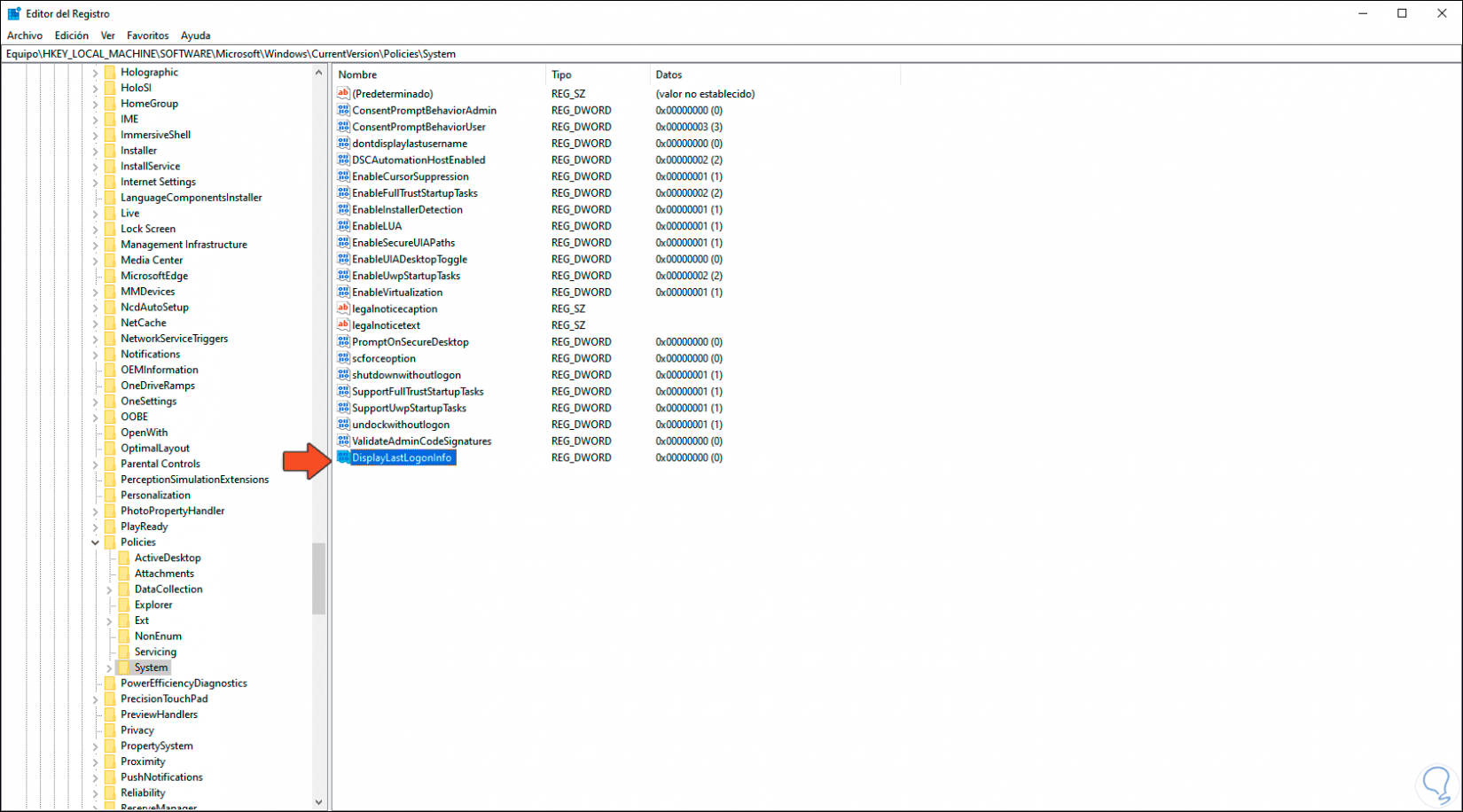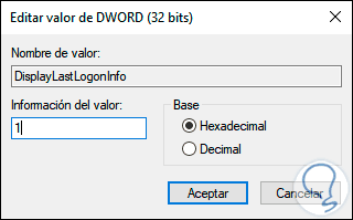 Nombramos el valor DWORD “DisplayLastLogonInfo”: