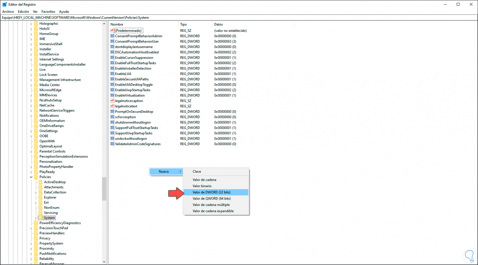 En los registros debemos ubicar el llamado “DisplayLastLogonInfo”, si no existe damos clic derecho en algún lugar libre y seleccionamos “Nuevo – Valor de DWORD (32 bits)”: