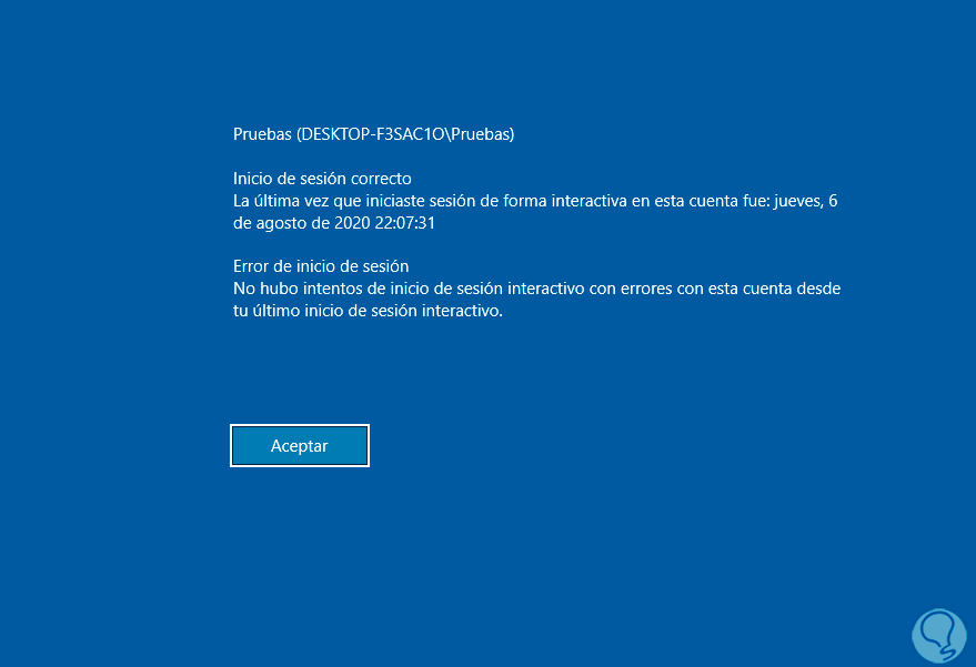Al reiniciar el sistema o encender el equipo veremos lo siguiente después de ingresar la contraseña. Allí encontramos detalles puntuales de los inicios de sesión correctos e incorrectos con su fecha y hora.