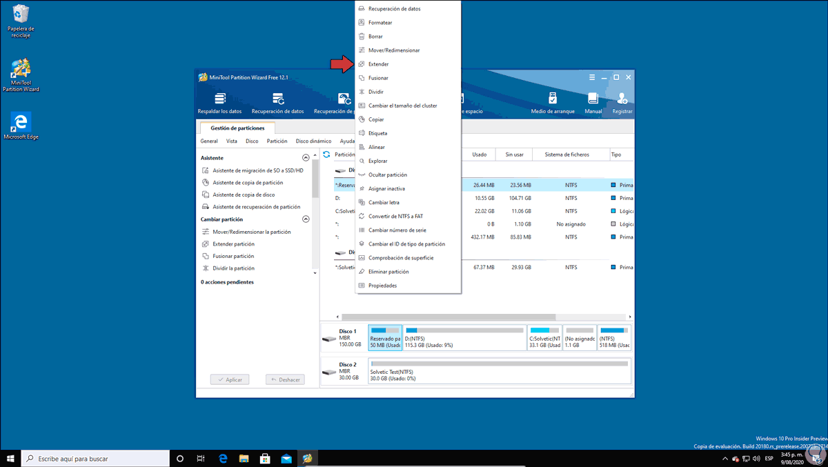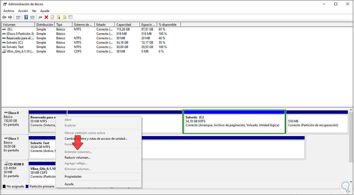Como vemos allí está disponible el espacio no asignado, para aumentar el tamaño de la partición reservada daremos clic derecho sobre esta y en el listado desplegado seleccionar “Extender”: