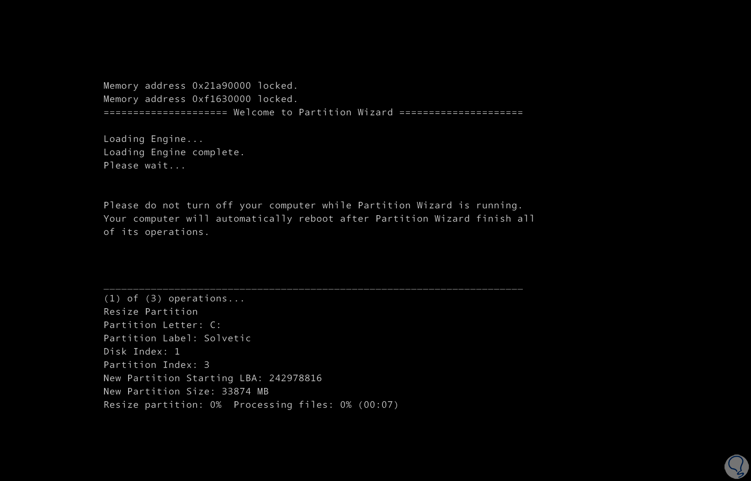 Confirmamos dando clic en Si y se iniciará el proceso de extensión de la partición seleccionada:
